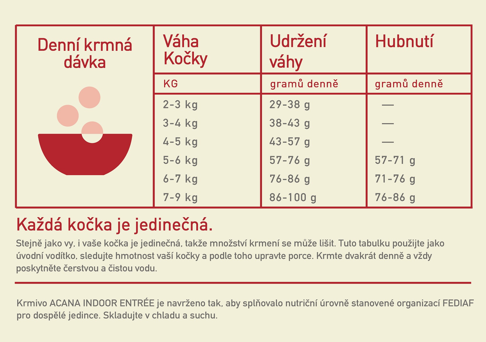 Maso je vždy naší ingrediencí č. 1. Nová receptura ACANA INDOOR ENTRÉE je plná volně chovaného kuřete a krůt, doplněná o lahodného králíka. To vše v poměru celé kořisti (maso, orgány, chrupavky a kosti), který přirozeně vyživuje vaši kočku. Díky krmivu ACANA Indoor Entrée poskytnete kočce všechny živiny, které potřebuje.