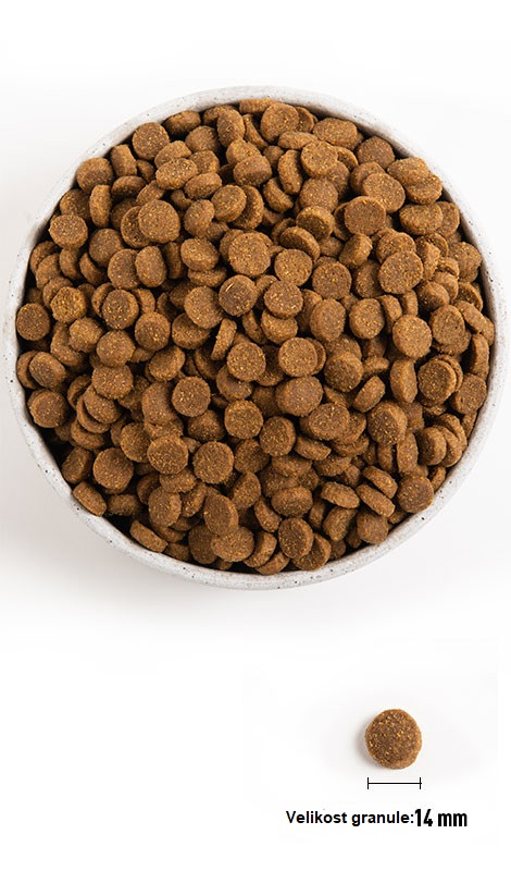 -50 % složení tvoří kvalitní maso, dalších 50 % zelenina, ovoce, oves, ječmen a bylinky