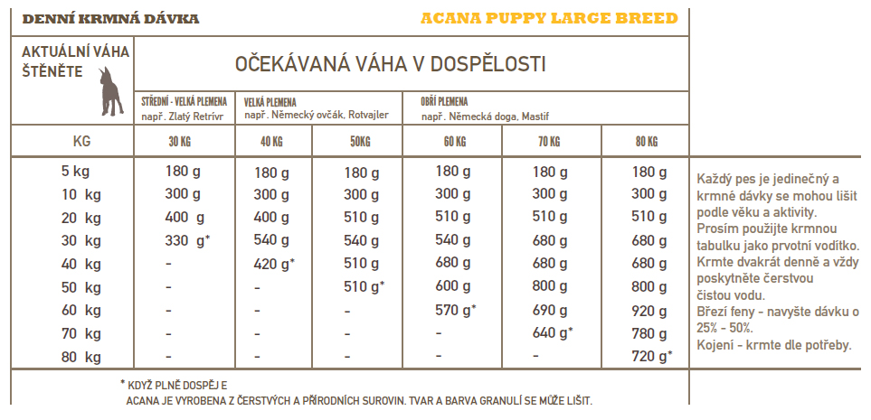 PŘIPRAVOVÁNO V NAŠICH OCEŇOVANÝCH KUCHYNÍCH V KANADĚ. ACANA PUPPY LARGE BREED PŘEKYPUJE VOLNĚ CHOVANÝMI KUŘATY, VEJCI Z HNÍZDNÍCH CHOVŮ, HEJKA LOVENÝM VOLNĚ V PŘÍRODĚ A NA SLUNCI ZRAJÍCÍM OVOCEM A ZELENINOU – VŠE DODÁVÁNO ČERSTVÉ Z NAŠEHO REGIONU. ACANA ZARUČUJE, ŽE UDRŽÍ VAŠE ŠTĚNĚ SPOKOJENÉ, ZDRAVÉ A SILNÉ. PŘEČTĚTE SI NAŠE SLOŽENÍ A VĚŘÍME, ŽE S NÁMI BUDETE SOUHLASIT.