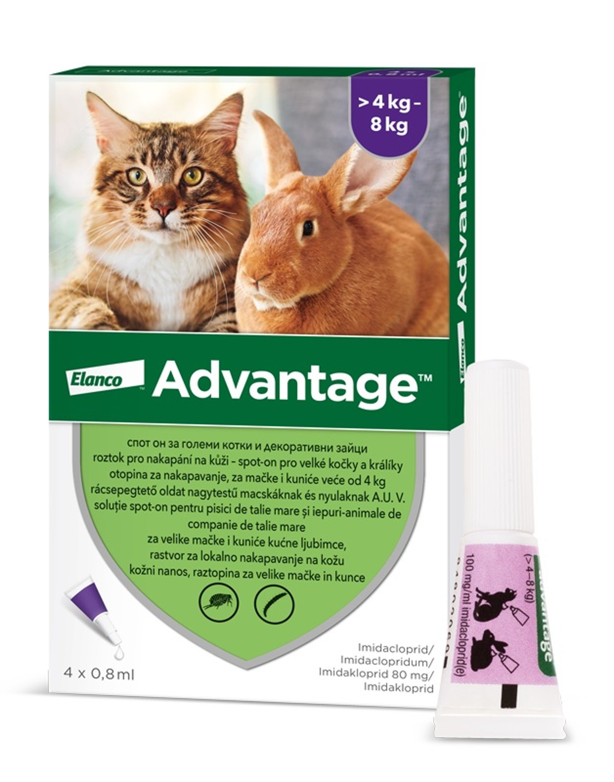 Advantage 80 pro kočky nad 4kg - prevence a léčba napadnutí koček blechami. Jedno ošetření chrání před dalším napadnutím blechami 3-4 týdny u koček a do 1 týdne u králíků. Lék se může aplikovat jako součást léčby alergické dermatitidy vyvolané blechami (FAD).