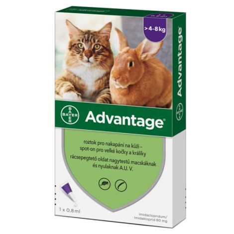 Advantage 80 pro kočky nad 4kg - prevence a léčba napadnutí koček blechami. Jedno ošetření chrání před dalším napadnutím blechami 3-4 týdny u koček a do 1 týdne u králíků. Lék se může aplikovat jako součást léčby alergické dermatitidy vyvolané blechami (FAD).