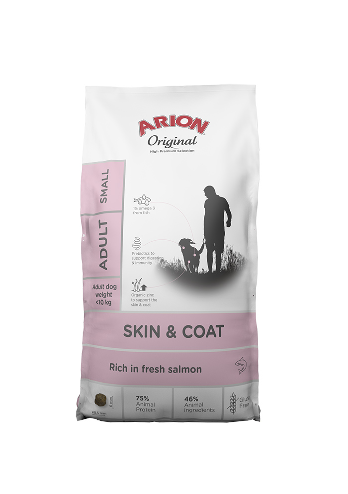 Arion Original Skin & Coat je kompletní krmivo pro dospělé psy. Tento bezlepkový recept na bázi ryb obsahuje jedinečnou směs mořských složek a organického zinku na podporu zdraví kůže a srsti vašeho psa.
