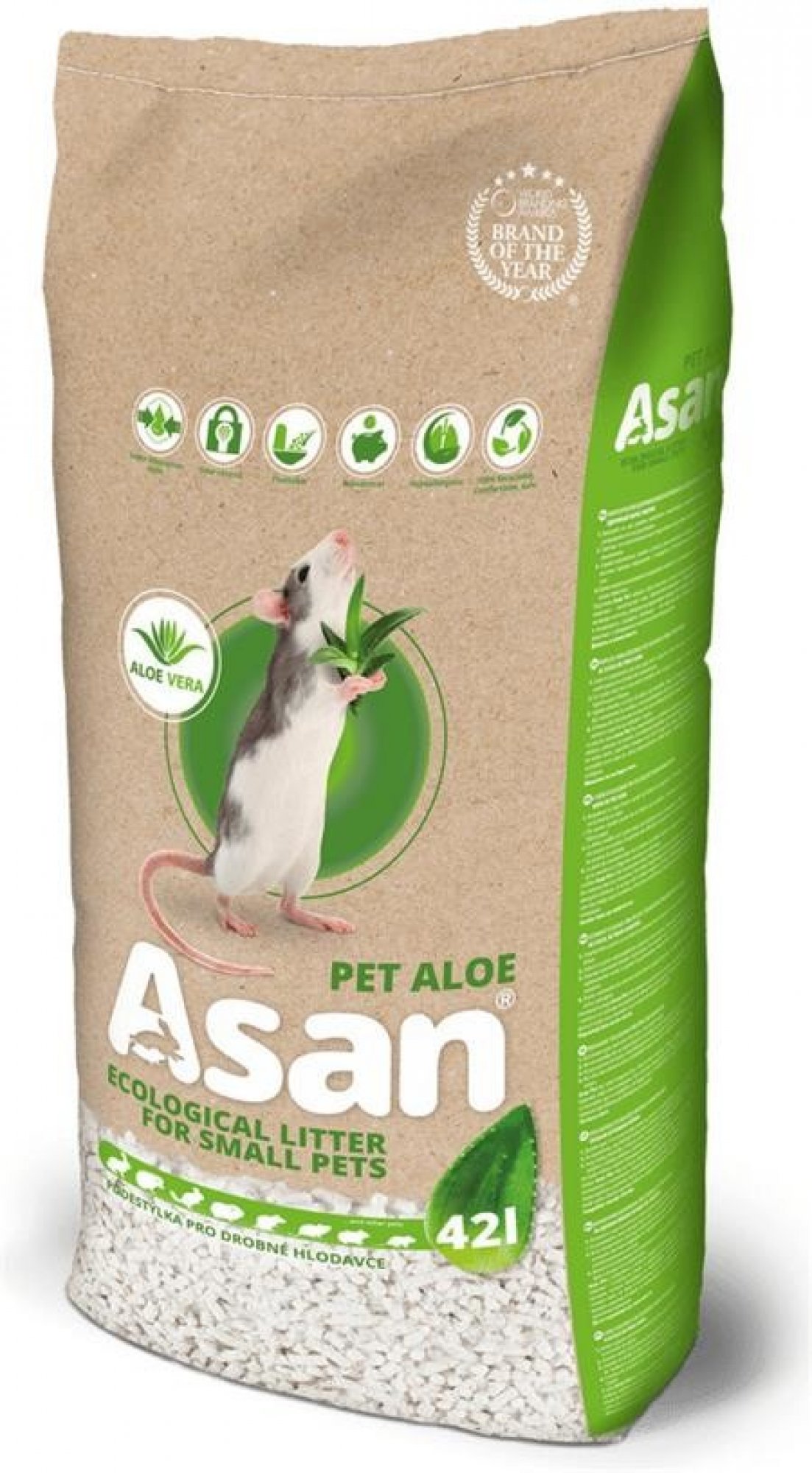 Pro zakrslé králíčky a hlodavce - s bio-kvalitním extraktem Aloe Vera pro zdraví zvířat - rychle a na dlouho absorbující pachy a vlhkost - s pelíškovitou jemností pro pohodu chovaných mazlíčků - bez prachu a ostrých hran granulí Návod k použití: Klec pro hlodavce naplňte vrstvou podestýlky vysokou cca 3 cm a rovnoměrně ji rozprostřete na dno klece. Po využití podestýlku zlikvidujte spláchnutím do toalety nebo kompostováním. Doba spotřeby podestýlky je přímo úměrná jak velikosti klece, tak počtu a stáří chovaných zvířat. Tip: Stelivo Asan Pet se osvědčilo i v chovech jiných zvířat – exotického ptactva, zvířat v teráriích a viváriích. Přednosti steliva: - Podestýlky Asan efektivně odstraňují pachy z okolí klece nebo chovného boxu - Asan je z 99% bez prachu a vzdušných alergenů. Tím je vhodný i pro chovatele alergiky a astmatiky. - S maximální efektivitou absorbují vlhkost a uzavřou jí uvnitř. Působí ode dna a povrch podestýlky tak zůstává stále suchý a pro zvířata příjemný na dotek. - Podestýlka je velmi lehká a snadno se s ní manipuluje, to i dětem. - Stelivo nevytváří vlhké mazlavé bláto, jehož stopy se těžko odstraňují z podlahových krytin. - Díky méně časté nutnosti výměny podestýlky Asan šetří výdaje domácnosti. - Steliva Asan jsou bezpečná pro chovaná zvířata i členy domácnosti. Potvrzeno ÚSKVBL. - Asan je šetrný k životnímu prostředí. Vzniká recyklací a je 100% rozložitelný. Snadno se likviduje – do toalety, do kompostu nebo nádob na bio-odpady.