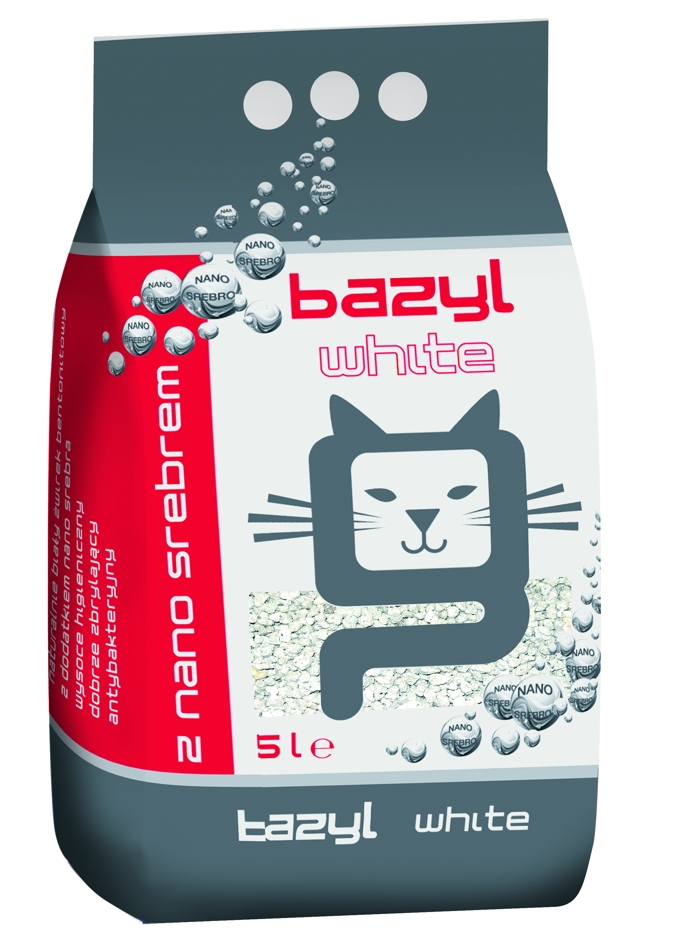 Bazyl White je přírodní bílý bentonit. Obohacený o částečky nano stříbra, které mají antibakteriální účinky, což z tohoto produktu dělá opravdu vysoce hygienické stelivo. Perfektně absorbuje nepříjemný zápach. Částice tohoto steliva jsou stejnorodé a mají vysoké hrudkující vlastnosti. S nulovou prašností. Nelepí se na srst ani na packy. Velmi efektivní a ekonomický, biologicky odbouratelný. Zrnitost 0,6 – 2,25 mm.