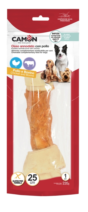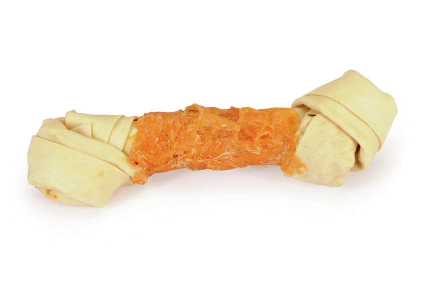 Doplňkové krmivo pro psy bez umělých přísad z kuřecích kůží ve tvaru uzle.