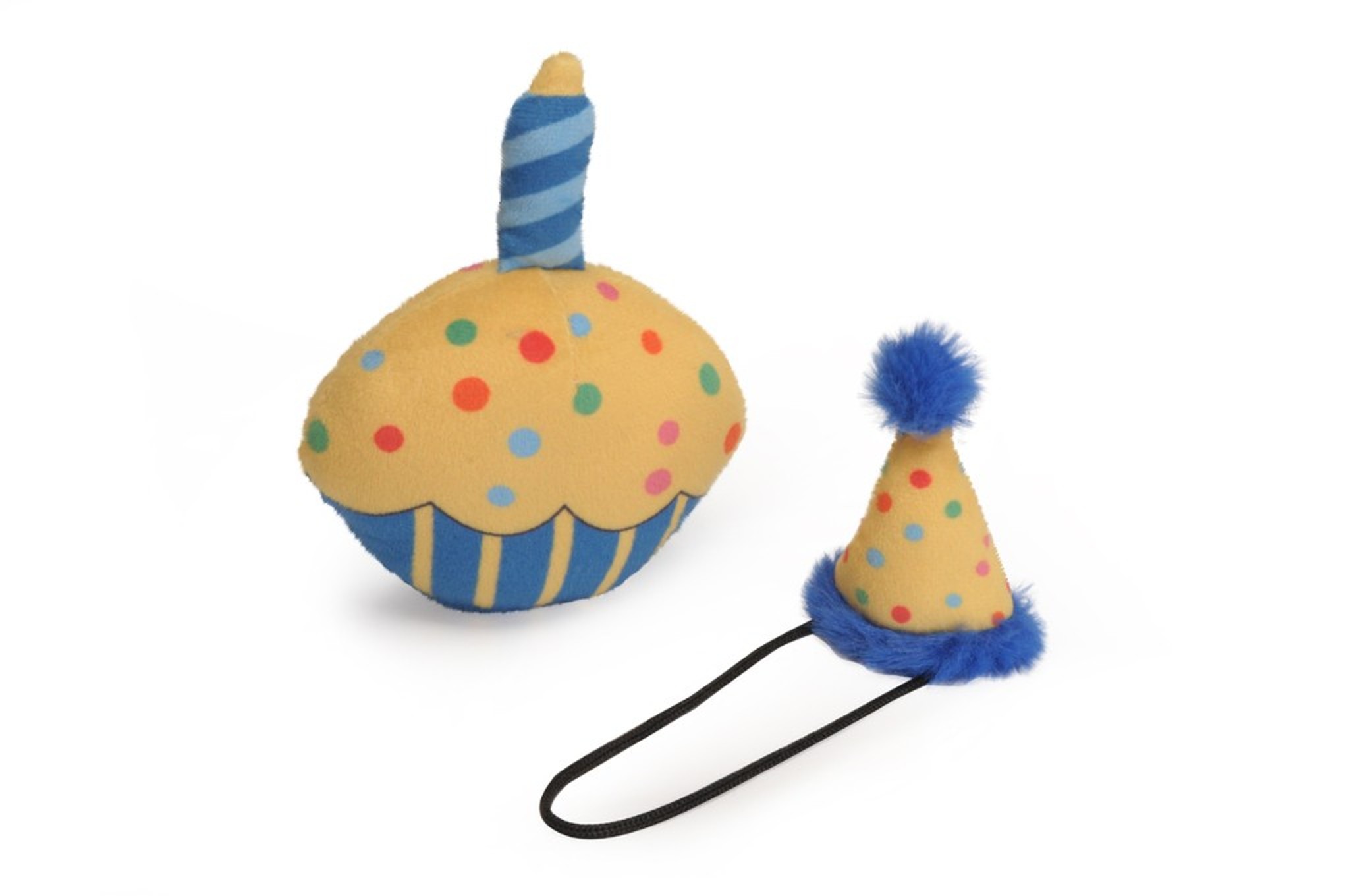 Vtipná a roztomilá sada hraček pro psa ve tvaru narozeninového dortíku a klobouku.