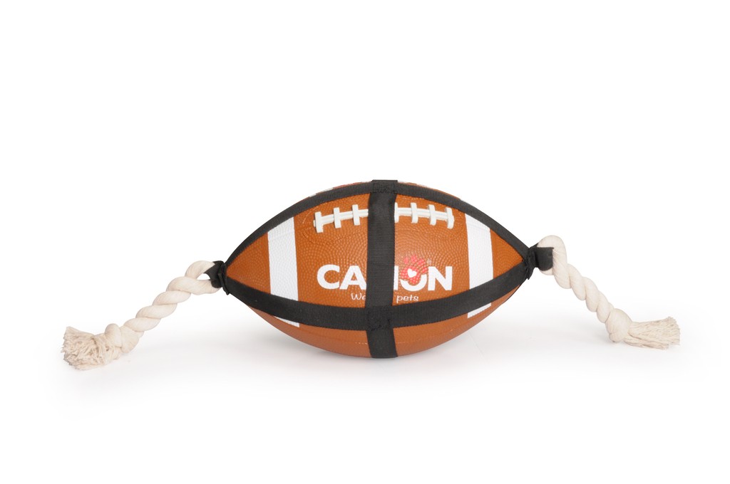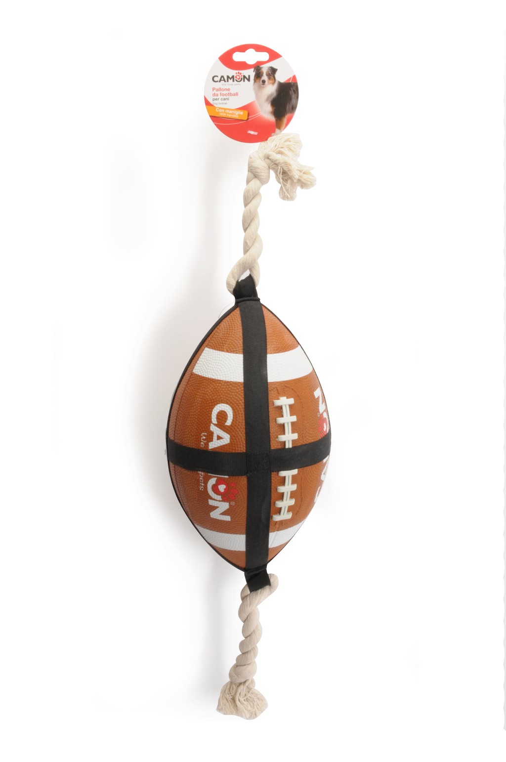 Zábavná hračka pro psa ve tvaru amerického fotbalového míče vyrobená z gumy s 2 úchyty z lana.