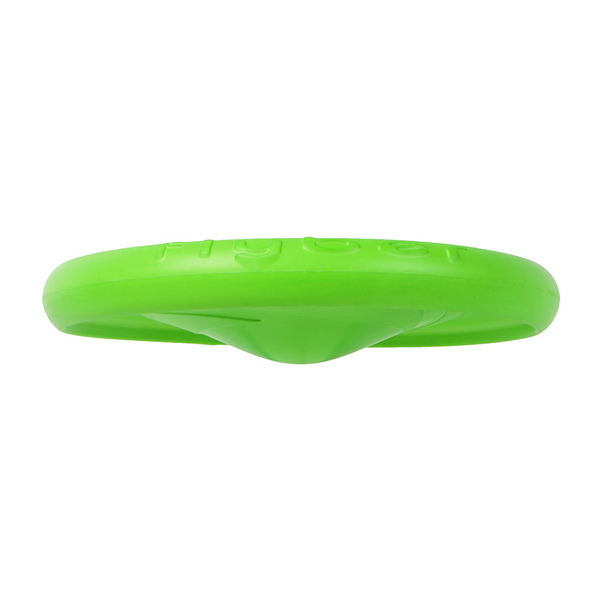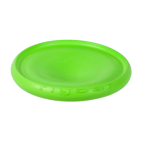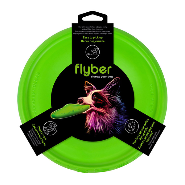 Oboustranný létající disk Flyber je vyroben z měkkého, pružného materiálu a proto je velmi jemný pro zuby a dásně. Tento materiál po čase ztratí hladký povrch, což je přirozená vlastnost materiálu. Díky své velikosti, tvaru a materiálu, do kterého se může pes narozdíl od sportovního frisbee zakousnout, je ideálním a všestranně použitelným doplňkem kolekce hraček vašeho pejska.