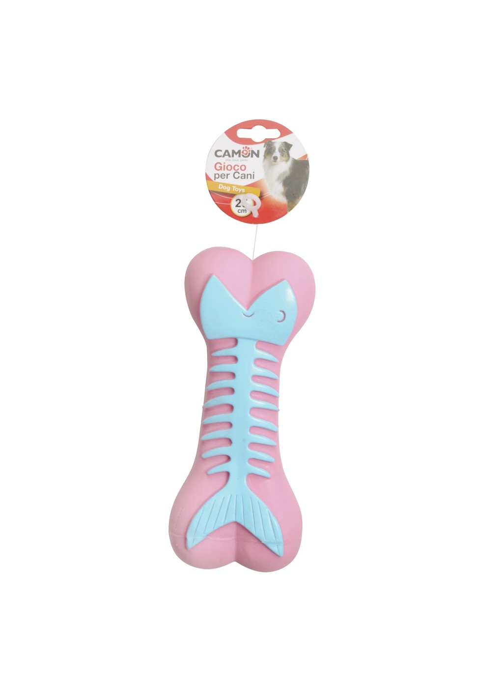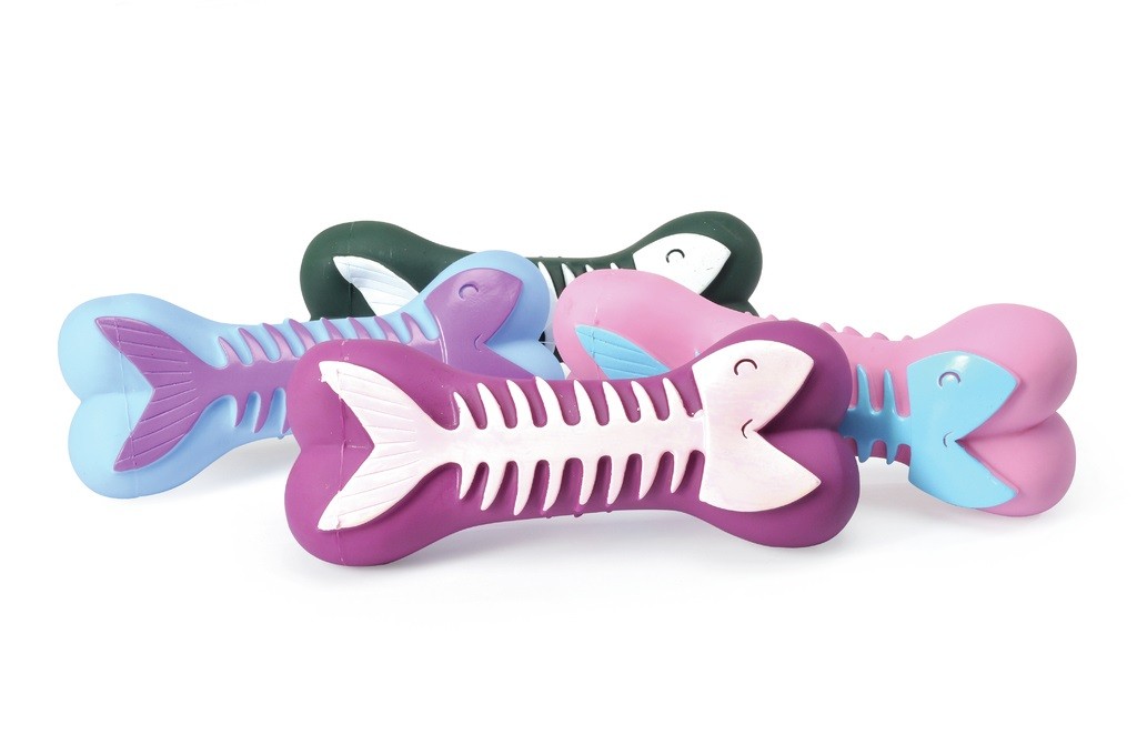 Vinylová hračka ve tvaru kosti s motivem rybí kosti.