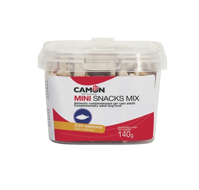 Box plný pamlsků ve tvaru kostiček. Doplňkové krmivo pro dospělé psy – s lososem.