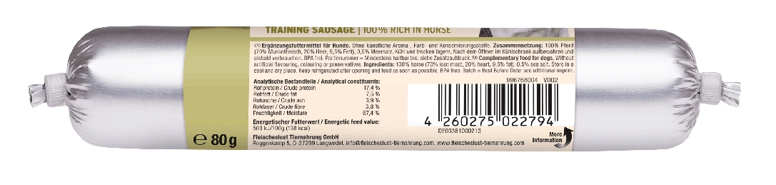 Složení: 61 % kůň (maso, srdce, játra), 9,5 % bramborový škrob, 7 % řepné řízky, 5 % krupice z tvrdé pšenice