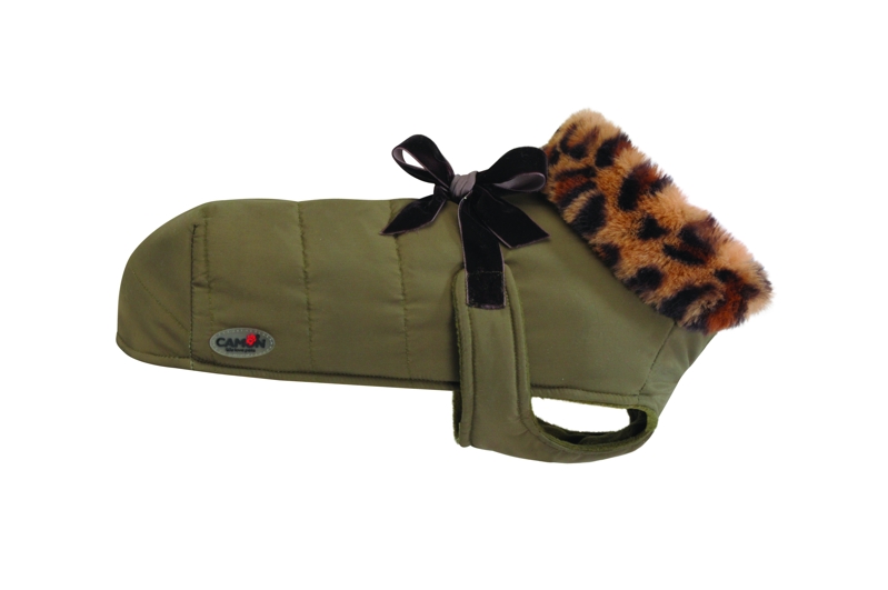 Bunda s lehkými vycpávkami, hřejivá fleecová podšívka, vnější látka krásně jemná na dotek, límec ze syntetické kožešiny, zavinovací zapínání na zadní straně se sametovou stuhou. Otvor se zipem na kroužek obojku a popruhy na zadní nohy.