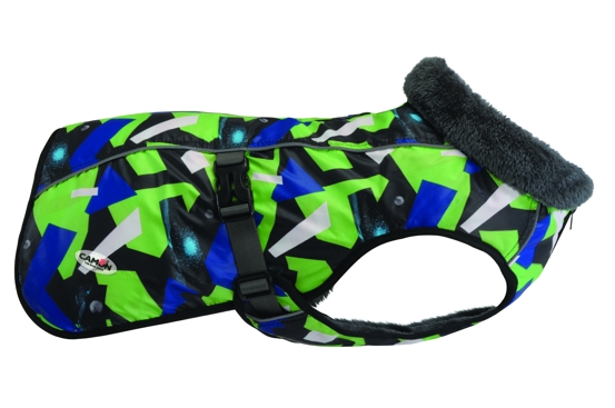 Bunda s vycpávkou, hřejivou fleecovou podšívkou, zapínáním na zip u krku, voděodolnou tkaninou, reflexními lemy a zavinovacím zapínáním a nastavitelnými bočními sponkami. Otvor se zipem na kroužek obojku a popruhy na zadní nohy.