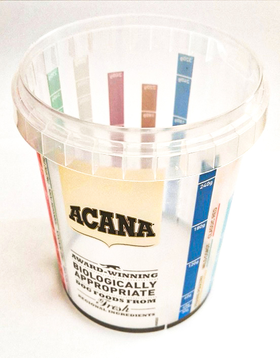 S odměrkou ACANA naberete přesné množství granulí pohodlně přímo z pytle či barelu. Odměrka má kolem dokola barevně odlišené pruhy s názvy jednotlivých receptur. Doporučujeme pro každodení používání a bezstarostné dávkování krmiva ACANA!