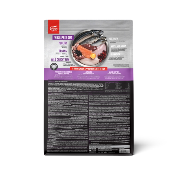 SLOŽENÍ: Čerstvé kuřecí maso (31%), syrová krůta (8%), syrový losos (6%), celý syrový sleď (5%), čerstvé kuřecí droby (játra, srdce) (4.5%), syrová krůtí játra (4%), celá syrová makrela (4%), čerstvá vejce (4%), dehydrované kuřecí maso (4%), dehydrované krůtí maso (4%), dehydrovaný sleď (4%), dehydrovaná kuřecí játra (4%), dehydrovaná vejce (4%), celá červená čočka, celý hrách, olej z tresky (3%), celá cizrna, celá zelená čočka, celé fazole pinto, celé fazole navy, hráškový škrob, tráva miscanthus, kuřecí tuk (0,5%), celá čerstvá dýně, čerstvá celá máslová dýně, sušená řasa, sušený kořen čekanky, celá čerstvá jablka, čerstvá celá mrkev, celé čerstvé hrušky, čerstvá celá cuketa, čerstvé listy červené řepy, čerstvá kapusta, čerstvý špenát, čerstvé listy tuřínu, celé borůvky, celé brusinky, celé plody muchovníku, kořen lopuchu, levandule, kořen ibišku, ostropestřec, šípky, kurkuma.