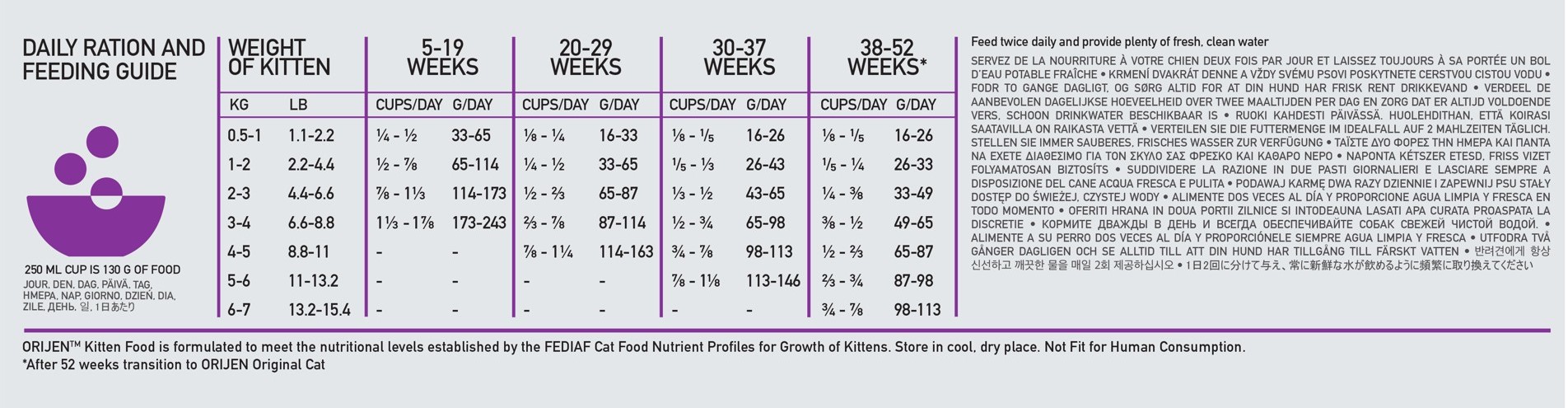 Krmivo ORIJEN® KITTEN je speciálně navrženo tak, aby vašemu kotěti dodalo všechny živiny tak, aby vyrostlo zdravé a silné. Obsahuje 90 % prémiových živočišných ingrediencí jako je kuře, krůta a losos. Obsahuje 15 čerstvých nebo syrových ingrediencí (2/3 obsahu balení), včetně ingrediencí zpracované metodou "Celá kořist", kdy se použije svalovina, orgány a kosti v ideálním poměru. Tato dieta pomáhá podporovat vývoj mozku a kognitivní funkce vašeho kotěte pomocí přirozeně se vyskytujících DHA a EPA z lososa, celé makrely, sledě a oleje z tresky. Vaše kotě bude prosperovat, když je budete krmit čerstvými a syrovými živočišnými bílkovinami, které potřebují.