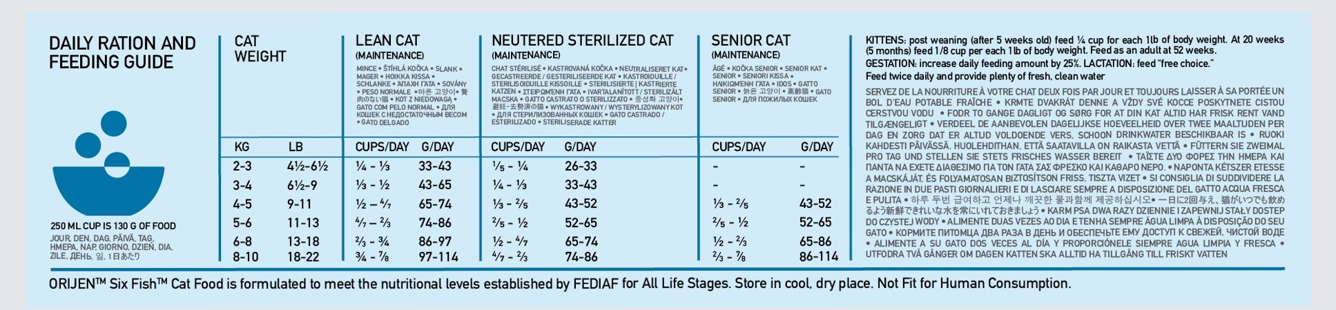 ORIJEN SIX FISH CAT je bezkonkurenční díky svému obsahu volně lovených ryb, které jsou nám dodávány čerstvé nebo syrové a celé, takže překypují živinami a skvělou chutí. Připravována exkluzivně v našich vítězně oceňovaných kuchyních NorthStar® zaručí krmiva ORIJEN, že vaše milovaná kočka nebo kotě budou zdravé, spokojené a silné. Přečtěte si naše složení a věříme, že budete souhlasit.