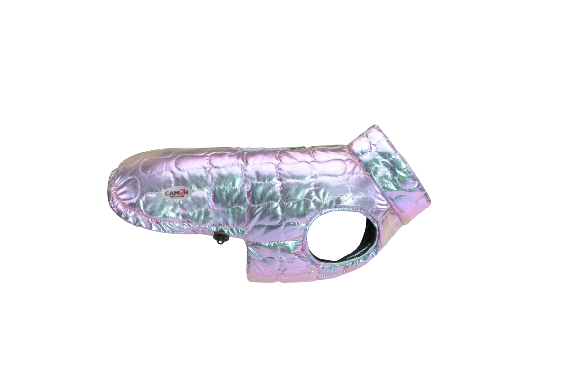 Voděodolná péřová bunda z duhové látky s černou podšívkou. Na zádech opatřeno bočními stahovacími šňůrkami. Zapínání na suchý zip na břiše. Otvor na zip pro kroužek postroje a elastické popruhy na zadní nohy. Model je vyroben z recyklovaného materiálu.