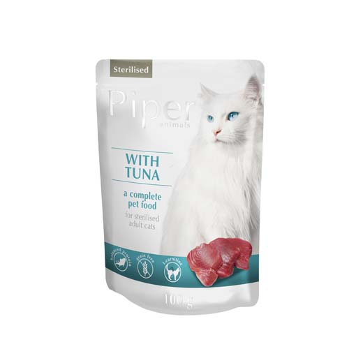 Složení: maso a vedlejší produkty živočišného původu 45%, vývar, ryba a vedlejší produkty z ryb (10% tuňák), deriváty rostlinného původu (hrachový škrob, frukto-oligosacharidy), minerální látky, Psyllium semena. Analytické složky: bílkoviny 10%, oleje a tuky 3,5%, popel 1,5%, vláknina 2%, vlhkost 82%, vápník 0,2%, fosfor 0,18%. Doplňkové látky/kg: Vitamin D3 240 IU, vitamin C (kyselina askorbová) 1050 mg, zinek (oxid zinečnatý) 13 mg, měď (síran měďnatý pentahydrát) 2 mg, mangan (oxid manganu) 0,5 mg, jód (jodičnan vápenatý) 0,4 mg, taurin 800 mg, L-karnitin 800 mg, DL-methionin 4000 mg, chlorid amonný 0,2 g / kg. Krmný návod: Podávejte při pokojové teplotě, 2x za den. Po otevření skladujte v chladničce.