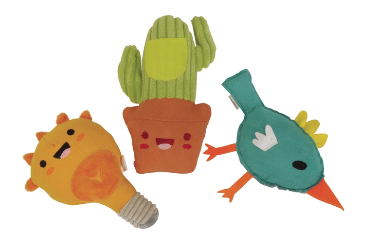 Pískací hračka pro psy ve třech provedeních - kaktus, ptáček a lampa.