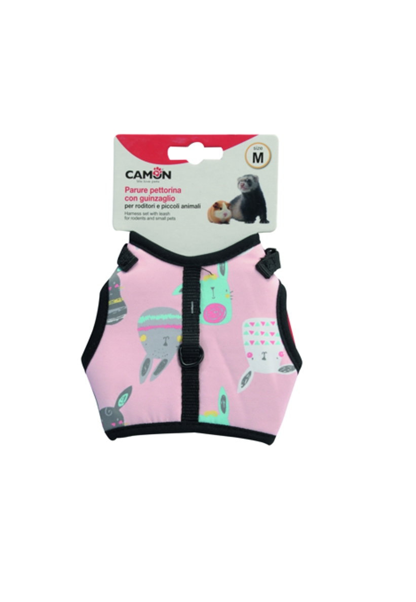 Sada postroje s vodítkem pro hlodavce a malá domácí zvířata. Poznámka: Když svému mazlíčkovi nasadíte obojek nebo postroj, ujistěte se, že můžete snadno vklouznout dvěma prsty mezi krk zvířete a vodítko. Často kontrolujte, zda pokožka v kontaktu s obojkem není podrážděná. Pravidelně kontrolujte opotřebení všech částí, abyste předešli nehodám. Materiál: Polyester.