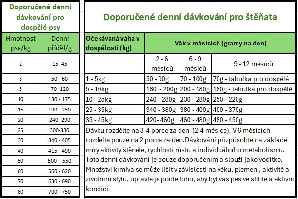 Denní dávkování je pouze doporučením a slouží jako vodítko. Množství krmiva se může lišit v závislosti na věku, plemeni, aktivitě a životním stylu, upravte je podle toho, aby byl váš pes ve štíhlé a aktivní kondici.