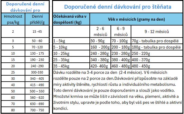 Denní dávkování je pouze doporučením a slouží jako vodítko. Množství krmiva se může lišit v závislosti na věku, plemeni, aktivitě a životním stylu, upravte je podle toho, aby byl váš pes ve štíhlé a aktivní kondici.