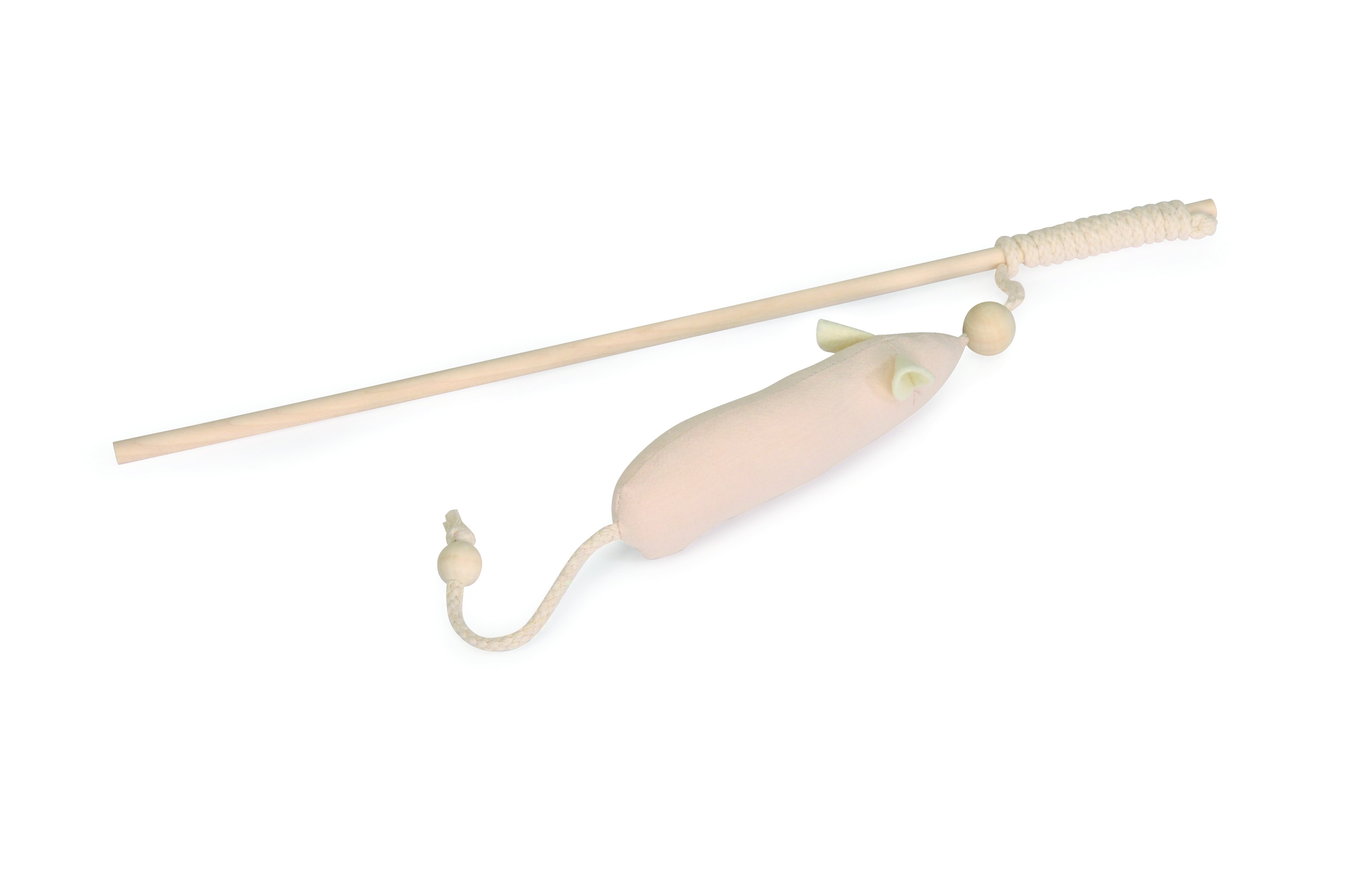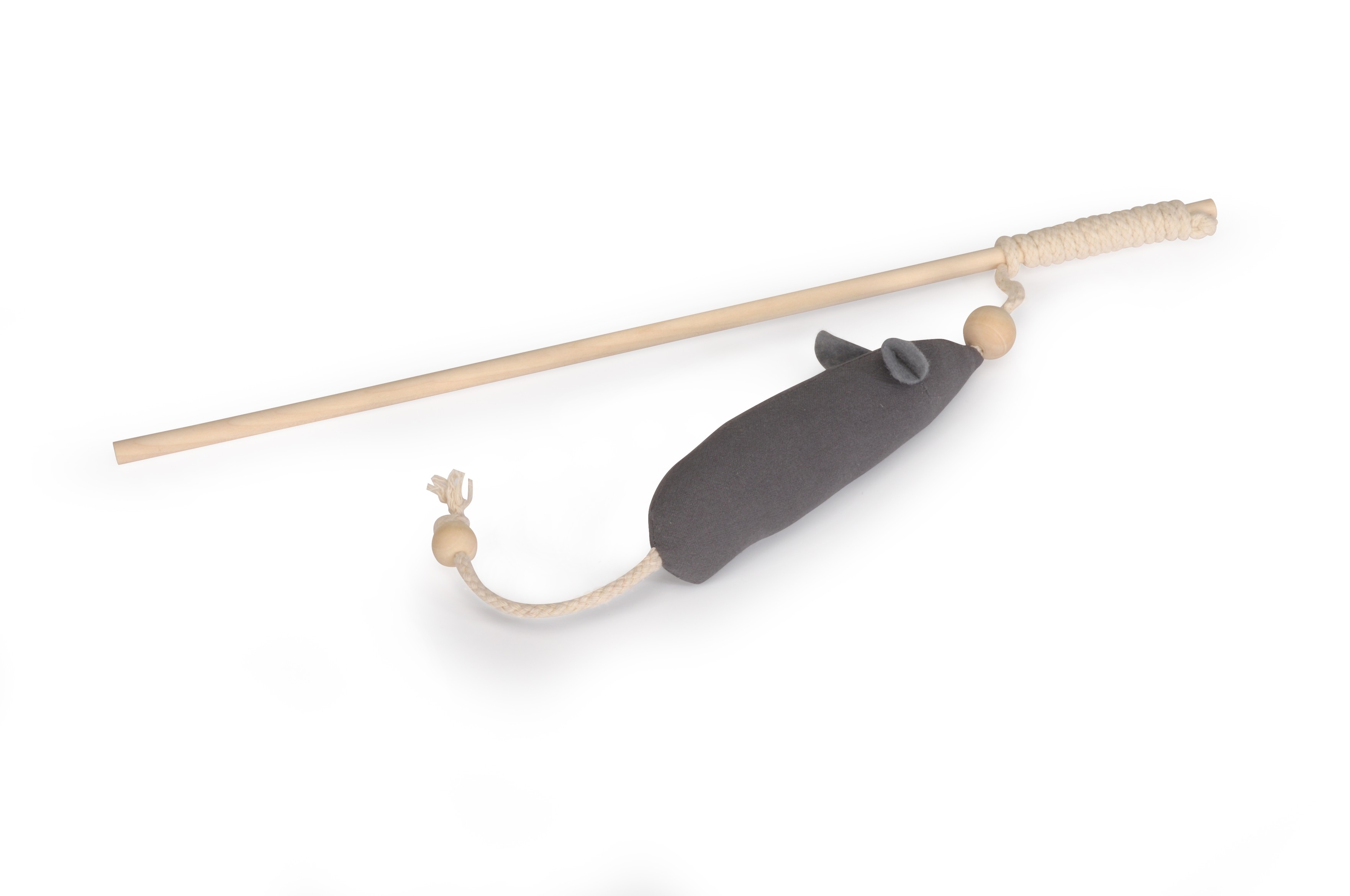 Legrační hračka pro kočky ve tvaru dřevěného rybářského prutu s bavlněnou a polyesterovou krysou. Obsahuje šantu kočičí. Dostupné ve 4 různých barvách - variantu uveďte do poznámky.