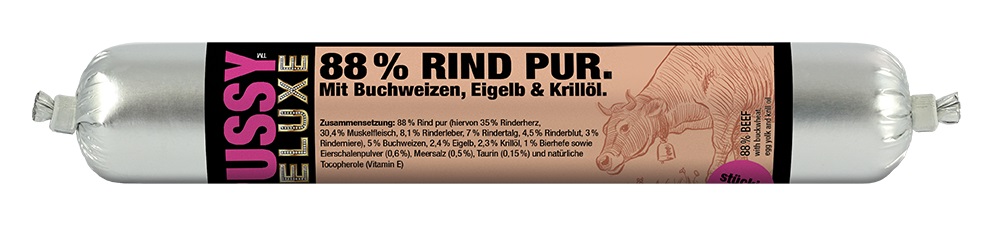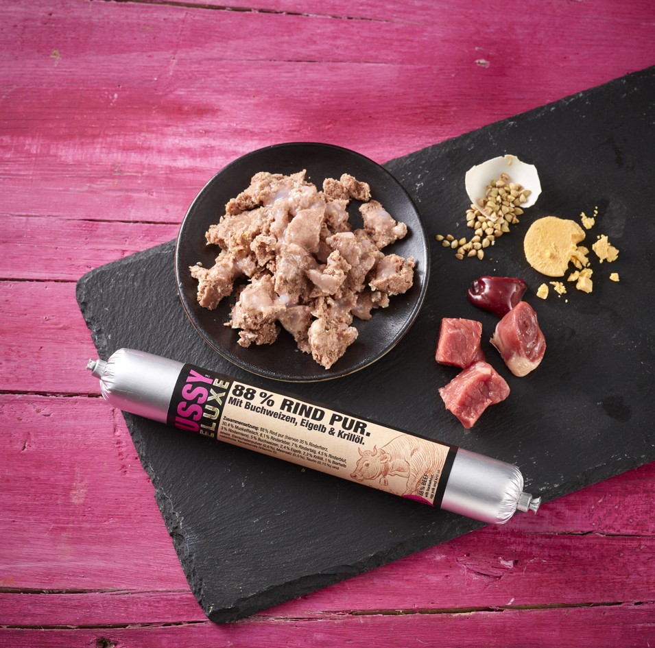 hovězí loj, 4.5 % hovězí krev, 3 % hovězí ledviny), 5 % pohanka, 2.4 % vaječný žloutek, 2.3 % olej krill, 1 % pivovarské kvasnice společně s práškem z vaječných skořápek (0.6 %), mořská sůl (0.5 %), taurin (0.15 %), a přírodní tokoferol (vitamin E).