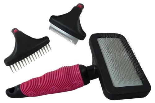 Tato vyčesávací sada obsahuje hřeben s vyměnitelnými hlavicemi pro dokonalé vyčesání vašeho mazlíčka. Gumová rukojeť se pohodlně drží a neklouže v ruce.