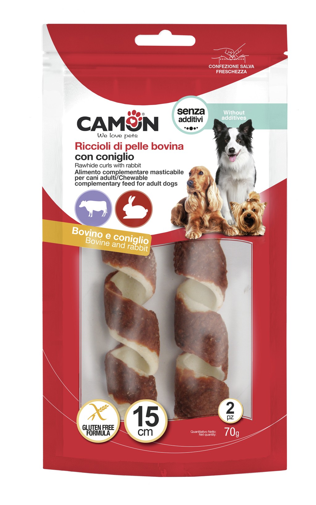 NÁVOD K POUŽITÍ: podávejte dospělým psům 1 ks (cca 36 g) denně jako pamlsek nebo zpestření a upravte podle toho denní krmnou dávku běžného krmiva. Vždy nechte svému psovi k dispozici misku s čerstvou vodou. Dohlížejte na svého psa při jídle nebo žvýkání doplňkového krmiva. Skladujte na chladném a suchém místě. Před použitím odstraňte deoxidátor. Vyrobeno a zabaleno v továrně se schvalovacím číslem 3700PF022 Camon S.p.A.