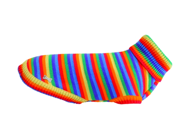 Svetr z akrylové příze vyrobený žakárovou technikou. Měkký rolák. Otvor na kroužek obojku a popruhy pro zadní nohy.