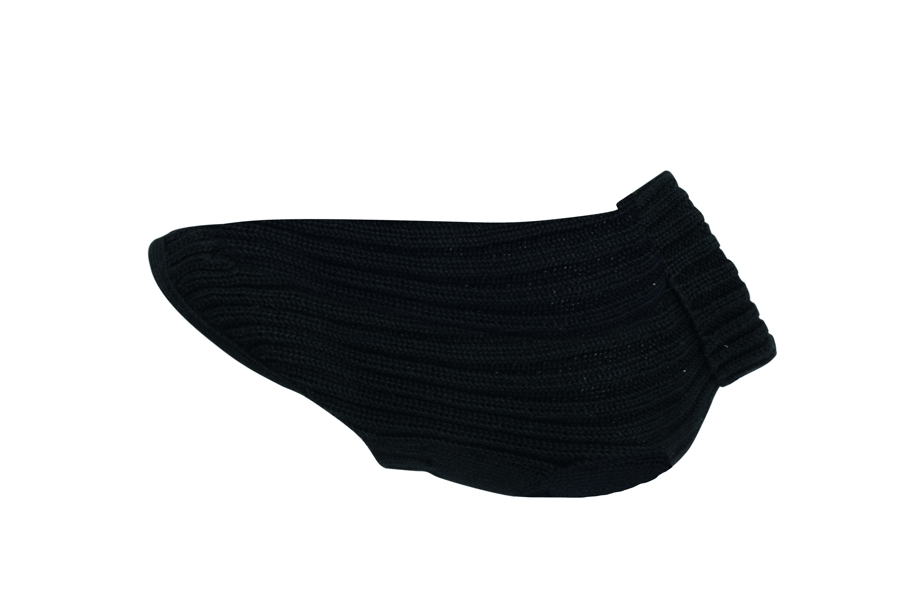 Svetr z 50% vlny a 50% akrylové příze s měkkým rolákem, žebrovaný úplet. Otvor na obojek a pásek na ocas. Vyrobeno v Itálii.
