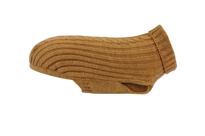 Svetr ze 20 % super jemné vlny alpaky, 30 % merino vlny, 50 % akrylové příze. Rolák z měkkého žebrovaného stehu a strečový břišní pás pro lepší usazení. Otvor na kroužek obojku a popruh na ocas. Vyrobeno v Itálii.