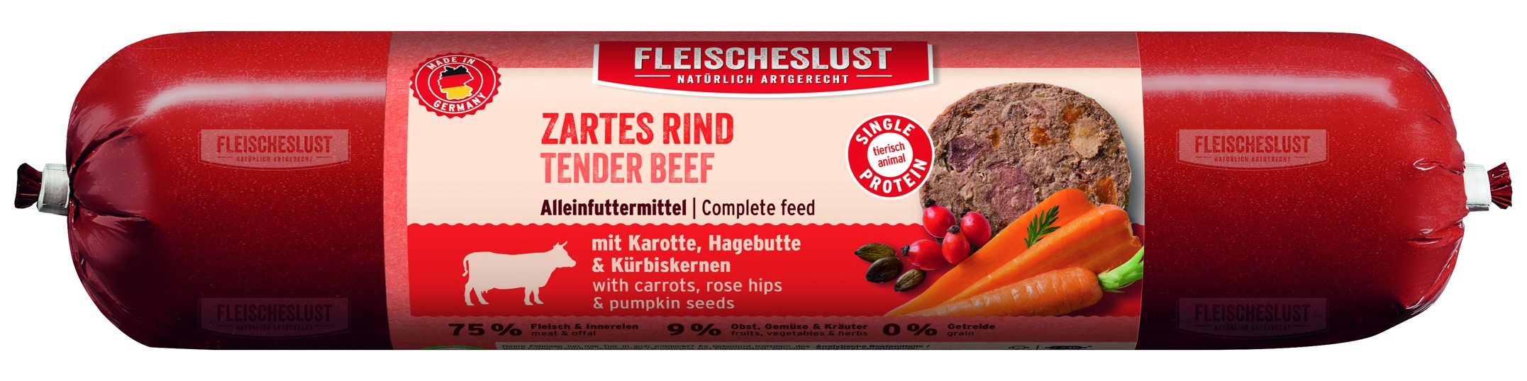 Tento salámek pro psy s hovězím masem, mrkví, šípky a dýňovými semínky obsahuje 75 % nejjemnějšího masa a drobů. Dále krmivo zahrnuje 9 % čerstvé křupavé zeleniny a lahodného ovoce, které je doplněno o vysokce kvalitní lněný olej bohatý na omega-3 mastné ksyseliny, který činí z tohoto kompletního krmiva ideální pochoutku pro psy. Mrkev je snadno stravitelná a má pozitivní vliv na trávení. Šípky jsou bohaté na vitamín C a minerální látky, které mají protizánětlivé vlastnosti a podporují imunitní sytém. Dýňová semínka obsahují cenné minerály, vitamíny a mastné kyseliny a tím posilují funkci močového měchýře.