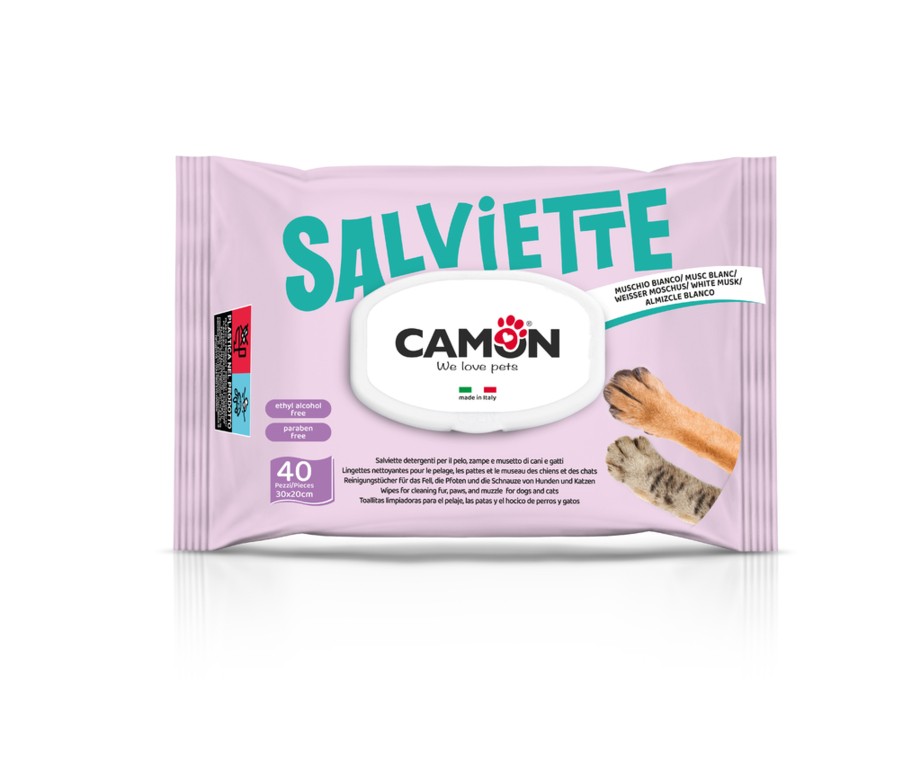 Velmi užitečné čisticí utěrky s vůní bílého pižma (MUSCHIO BIANCO) pro vašeho domácího mazlíčka. Odstraňují zápach a čistí srst, tlapy, čenich nebo uši. Osvěžují, vyživují a jemně chrání srst domácího mazlíčka. Množství (každý balíček): 40 ks Velikost: 20x30 cm